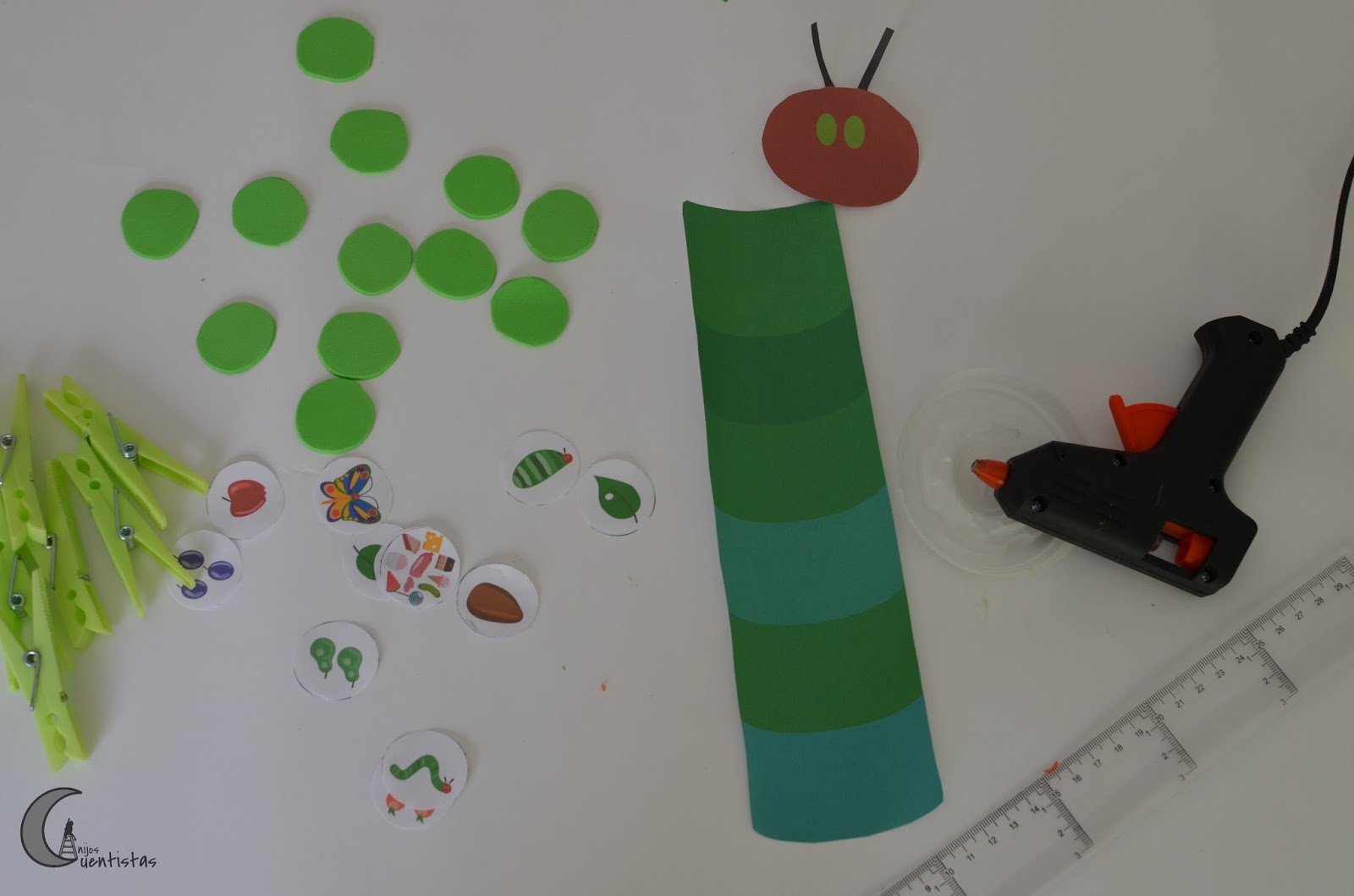 – Materiales :Una regla, imprimibles, goma eva, silicona, pinzas, tijeras, pegamento, cinta adhesiva de color verde (opcional), papel verde.