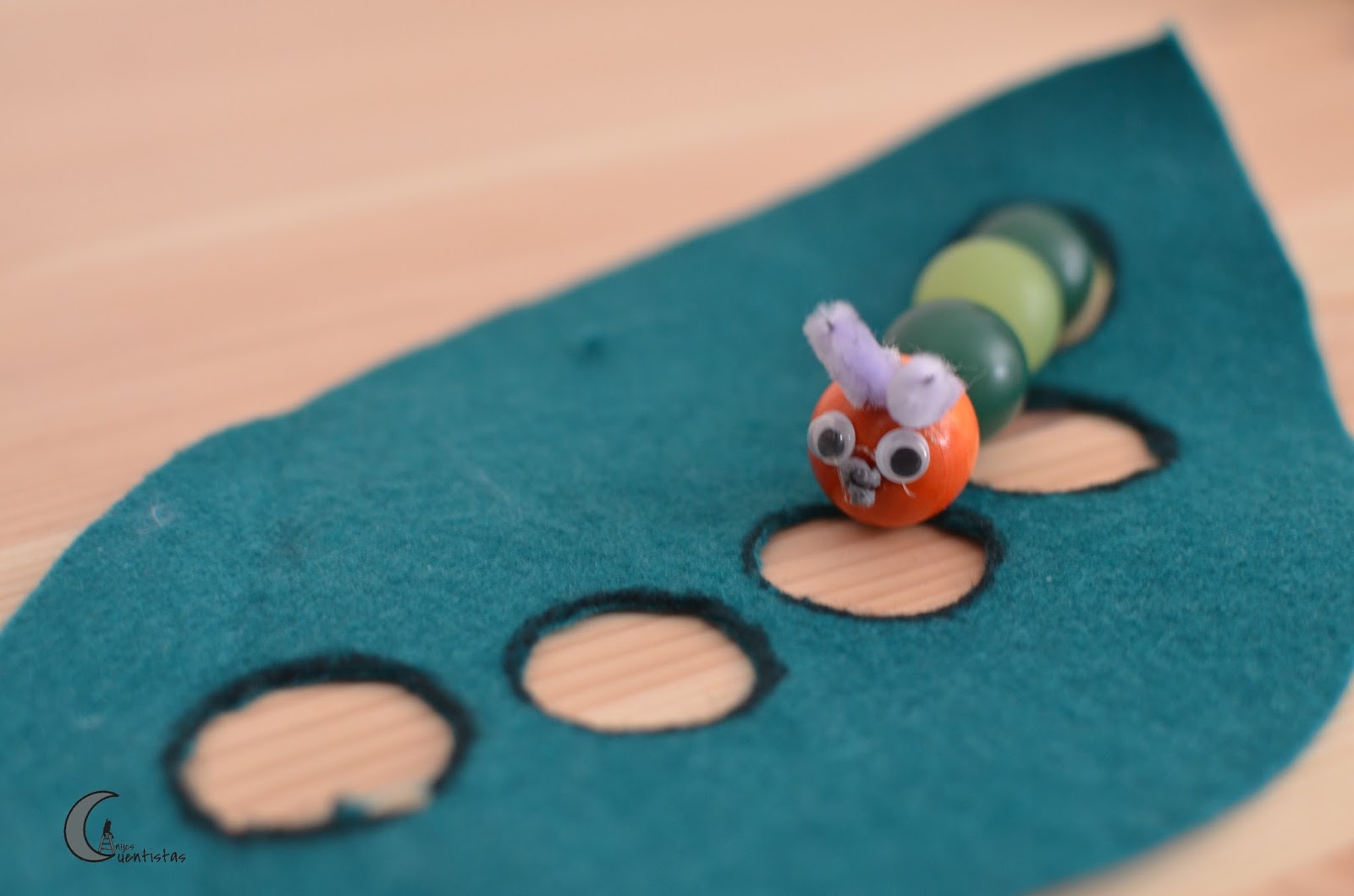 La idea original de esta actividad con la oruga glotona , es para hacer un juego de restas y sumas con las cuentas, de la página El blog de bombones pero mi canijo aun es muy pequeño y le cuesta mucho ensartar y acaba frustrándose, así que decidí dejarlo para otro momento y hacerle un juguete que nos servirá para contar el cuento con la pequeña oruga glotona.