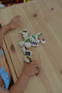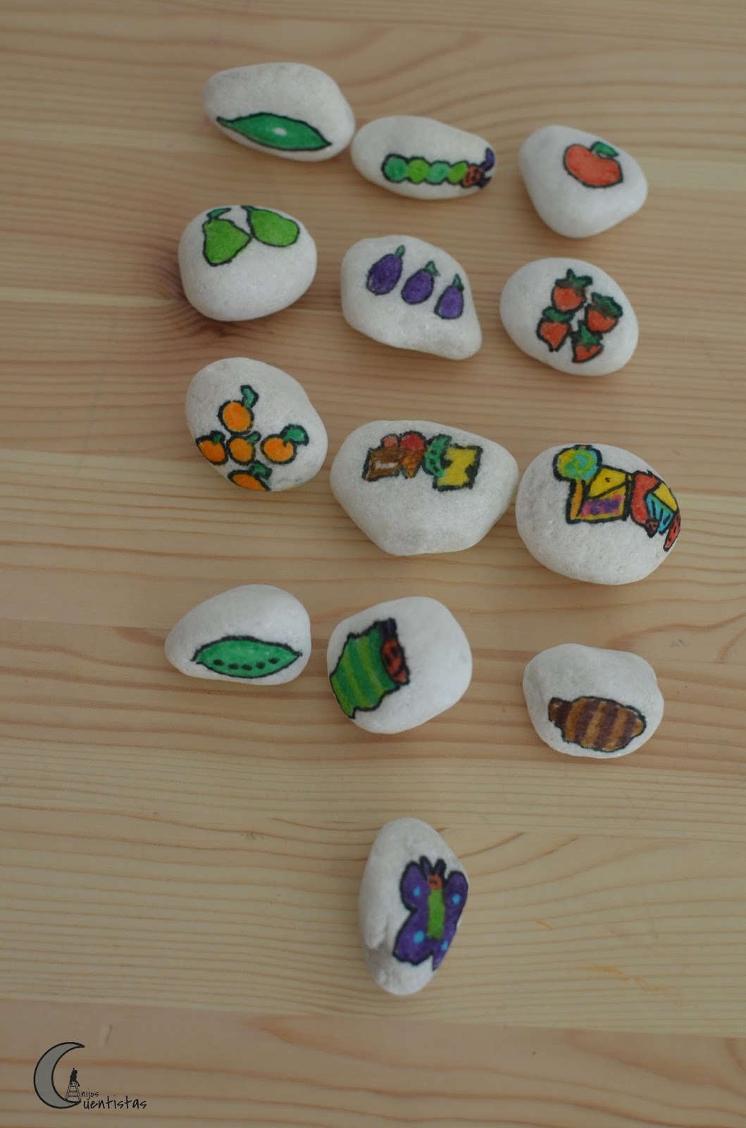 Son piedras de jardín que primero hemos lavado y después hemos pintado imitando las imágenes del cuento, esta vez no enlazo ninguna página por que hay miles que han hecho lo mismo cada una con sus propias imágenes y estas pues son las mías.