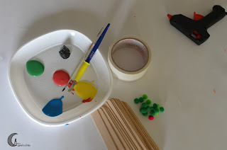 – Materiales: palos de helado sin color, temperas, cinta adhesiva blanca (de papel), pompones, limpia pipas, ojos de manualidades, pistola de silicona.